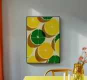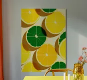Un'opera d'arte digitale audace e giocosa con fette di limone e lime stilizzate disposte in un vivace motivo geometrico. Con ombre nitide e una texture tattile della carta, questo disegno fonde l'estetica Bauhaus con la freschezza mediterranea. Perfetto per l'arredamento della cucina, per le stampe estive o per gli amanti dell'arte moderna da parete.
