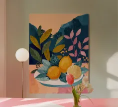A vibrant still life features lemons and green leaves against a background of patterned tiles and abstract textures. Bright yellows and deep greens contrast with the blue and white decorative motifs, evoking a Mediterranean feel.