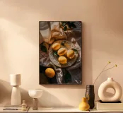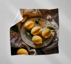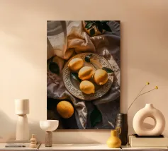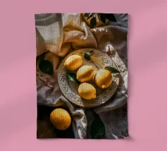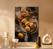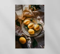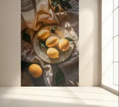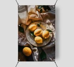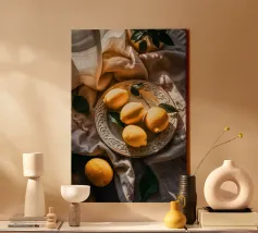 Un tocco di Toscana nella luce del mattino: questo poster fotografico di alta qualità mostra limoni gialli e soleggiati su porcellana decorata, inseriti in una calda cornice tessile con una delicata incidenza di luce. Perfetto per la cucina, la sala da pranzo o il salotto mediterraneo. Ideale per gli amanti della food photography, della vita lenta e dell'estetica nostalgica e vintage.