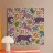Un disegno sofisticato con leopardi o ghepardi viola che camminano tra fiori fitti e stravaganti nei toni del viola e dell'arancione, il tutto su uno sfondo chiaro e puntinato.