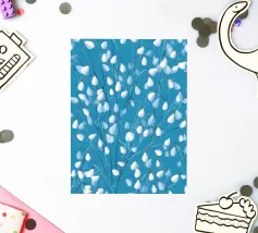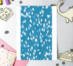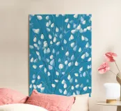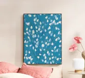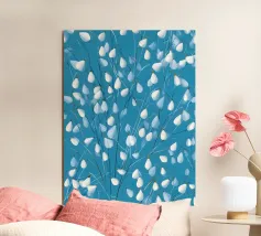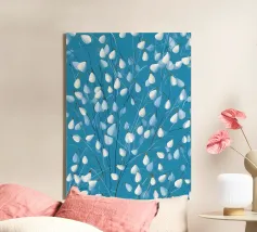 Questo pezzo parla di liberazione. I fiori bianchi si muovono liberamente su un campo blu calmo, senza legami, leggeri e non forzati. Non c'è fretta: solo ritmo, respiro e spazio. È il tipo di opera d'arte che tranquillizza una stanza senza scomparire, invitando l'occhio a rallentare e la mente ad allentare la presa.