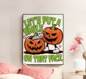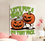 Due zucche maliziose con ghigni minacciosi. La frase "Let's put a smile on that face" (mettiamo un sorriso su quella faccia) è riportata in grassetto, a caratteri scherzosi.