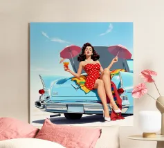 Sperimentate la massima libertà e avventura con le nostre opere d'arte vintage. Sentite il sole sulla pelle mentre guidate lungo la costa in una classica decappottabile. Immaginate il vento tra i capelli mentre una pattinatrice spensierata scivola sull'oceano. Questo capolavoro cattura la nostalgia di un viaggio in auto retrò e vi avvicina alla bellezza di una vita senza limiti. Perfetto per ogni appassionato di arte e avventura".