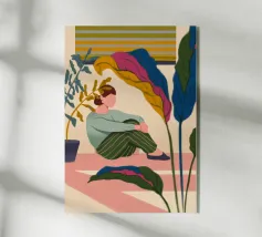 Un'illustrazione di una persona con una camicia a righe, intenta a leggere un libro, su uno sfondo di foglie verdi, che cattura un momento di quiete e di studio.