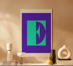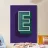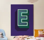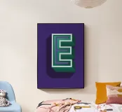 E maiuscola in rilievo con dettagli su sfondo blu.