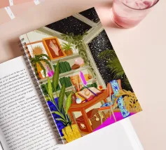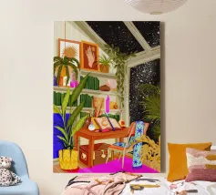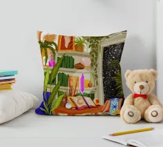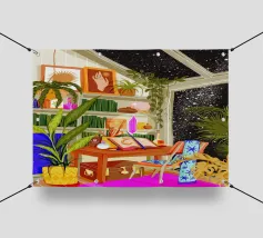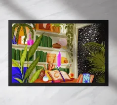 scrivania sedia librerie libri piante da interno piante in vaso lampada cristallo finestra guardare le stelle cielo stellato cuscino decorativo coperta tappeto opera d'arte luce solare soffitto lucernario piante tavolo