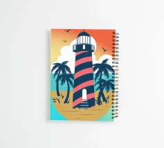 lighthouse palms tropical-beach coastline birds sunset-sky soft-sand sea-horizon clouds stairs observation-deck lighthouse-window lighthouse-tower striped-pattern silhouetted-palms dusk-atmosphere calm-sea beach-vacation ocean-view coastal-scene