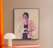 Illustrazione di una donna che tiene in mano 2 gigli. Indossa una giacca rosa a righe.