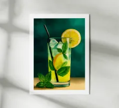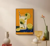 L'immagine mostra una bevanda rinfrescante in un bicchiere con cubetti di ghiaccio, fette di limone e foglie di menta. Dal bicchiere fuoriesce una cannuccia a righe bianche e blu. Lo sfondo arancione caldo contrasta fortemente con la superficie blu scuro su cui poggia il bicchiere. Lo stile dell'immagine è illustrativo e sembra dipinto a mano, con colori forti e linee chiare e definite. La combinazione di contrasti cromatici e la rappresentazione semplificata conferiscono all'immagine un'estetica moderna e fresca che trasmette perfettamente uno stato d'animo estivo.