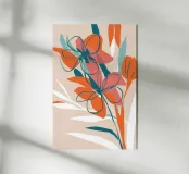 Un'elegante composizione astratta di fiori resa con un'espressiva line art arancione su forme di sfondo morbide e neutre. Lo stile è moderno e delicato.