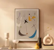 Forme astratte di vari colori sono disposte su uno sfondo neutro, creando un senso di equilibrio e movimento. Linee delicate si intersecano con forme audaci, aggiungendo un interesse visivo dinamico.