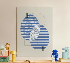 Audaci strisce blu e bianche creano forme geometriche in una composizione astratta. Il motivo forma un gioco dinamico di linee e curve, generando un intrigante ritmo visivo.