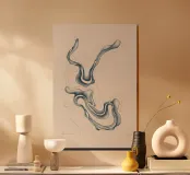 Questa immagine è composta da linee e forme astratte e fluide nei toni del blu e del grigio su uno sfondo chiaro. Le linee creano un senso di movimento e di flusso, rendendo la composizione dinamica e intrigante.