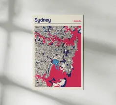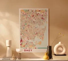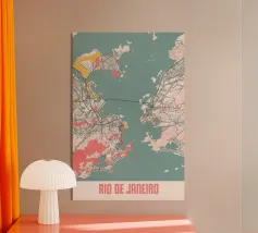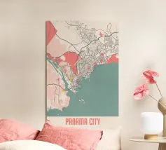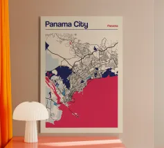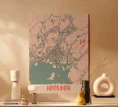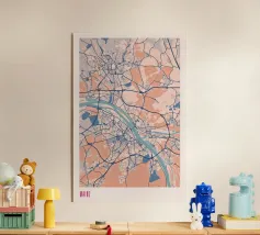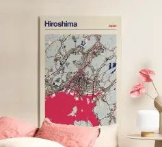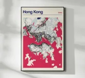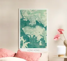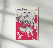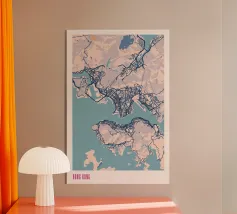 Una mappa artistica di Hong Kong che cattura l'armoniosa combinazione di paesaggio urbano e costa con strutture e colori chiari.
