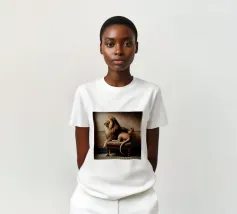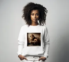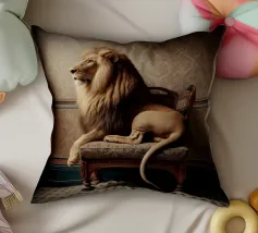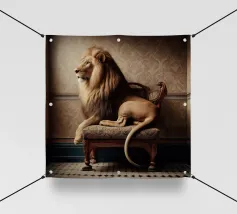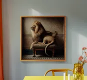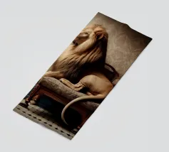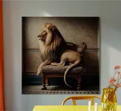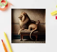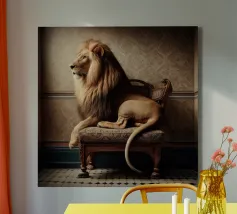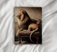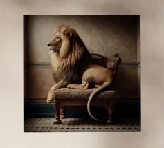 Un ritratto surreale ma elegante che reinterpreta il potere attraverso una calma compostezza. Un leone giace tranquillamente su una sedia decorata, con un atteggiamento rilassato ma sicuro, che unisce una forza indomita a una raffinata domesticità. L'ambientazione classica e la luce morbida e direzionale conferiscono alla scena un carattere pittorico e senza tempo, mentre la disposizione inaspettata trasforma l'immagine in qualcosa di stravagante e autorevole allo stesso tempo.