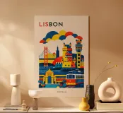 A bold, graphic celebration of Lisbon, expressed through clean geometry and vibrant colour blocking. Iconic riverside landmarks and hillside architecture are layered into a lively composition, capturing the city’s rhythm, light, and maritime character. Strong silhouettes and playful contrasts give the artwork energy while keeping the design clear and balanced.