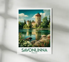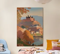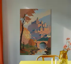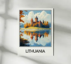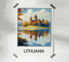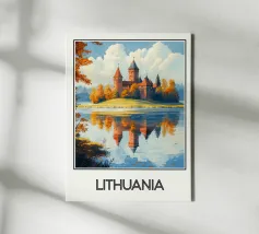 Ammirate l'incantevole bellezza della Lituania con questo superbo poster. Un castello medievale circondato da foreste dai colori autunnali, riflesso in un lago tranquillo, perfetto per una decorazione murale elegante e rilassante.