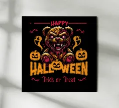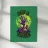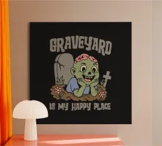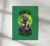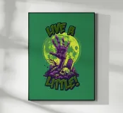 Illustrazione di una mano di zombie che emerge dalla tomba di notte, sullo sfondo di una luna piena incandescente, di una spettrale lapide e di un teschio decaduto. Le audaci tonalità verdi e viola creano un disegno inquietante, ispirato ad Halloween.