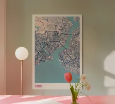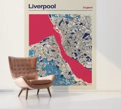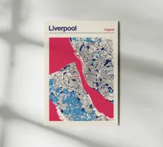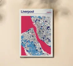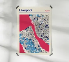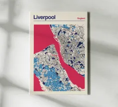 Immergetevi nella bellezza marittima di Liverpool con questa moderna opera d'arte cartografica! La suggestiva silhouette del fiume Mersey divide la città in vibranti tonalità di rosso e blu, mentre l'intricata rete di strade cattura il carattere unico della città portuale. Un must elegante per i fan di Liverpool e gli amanti dell'arte urbana.