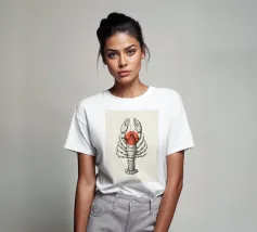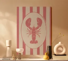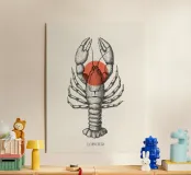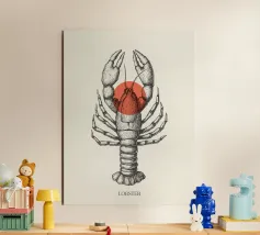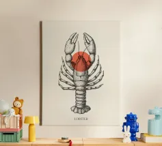 Poster vintage di aragosta linolevigata con un'illustrazione dettagliata in bianco e nero e un deciso accento rosso. Un'opera d'arte da parete perfetta per l'arredamento costiero, gli amanti dei frutti di mare, le cucine, i ristoranti o gli interni di ispirazione nautica. Stampa di alta qualità con un tocco moderno e minimalista.