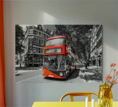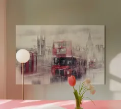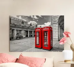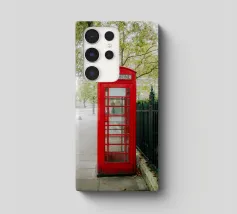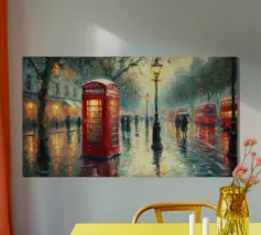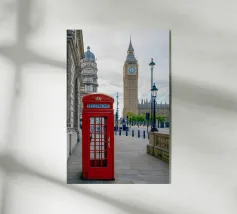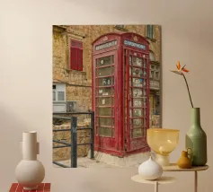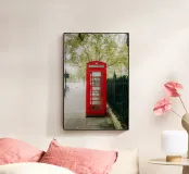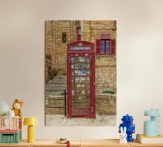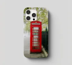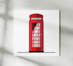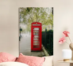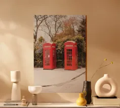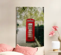 Un'iconica cabina telefonica rossa si trova di fronte a una recinzione in ferro battuto, circondata da alberi dai colori autunnali. Lo sfondo mostra una tranquilla strada acciottolata con alcune biciclette e pedoni in lontananza. La luce è morbida e diffusa, per enfatizzare l'atmosfera nostalgica e far risplendere il colore rosso vivo della cabina telefonica. Un motivo classico che incarna il fascino britannico e l'eleganza senza tempo.