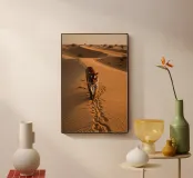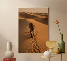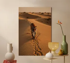 In questa accattivante opera d'arte, una tigre solitaria attraversa la vasta distesa di un deserto cotto dal sole. Le sabbie dorate si estendono all'infinito in ogni direzione, con le loro increspature e dune che formano un netto contrasto con le vibranti strisce arancioni e nere della tigre. La feroce bellezza del maestoso animale si staglia contro il paesaggio desolato, emanando forza e vulnerabilità allo stesso tempo. Il sole è basso nel cielo e proietta una calda tonalità dorata che avvolge la scena in un bagliore etereo. Le ombre danzano sulla sabbia, accentuando i potenti muscoli della tigre che si muove con grazia e determinazione. Nella distan