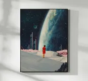Non si può aver amato e dimenticare. ~ Donna con cappotto rosso che guarda un pianeta gigante in piedi in un paesaggio futuristico surreale, elementi di architettura floreale retrò.