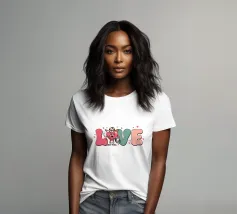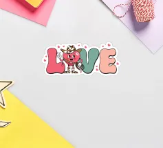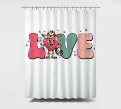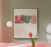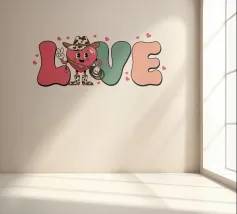 Un personaggio a forma di cuore vestito da cowboy si trova al centro della parola "LOVE", aggiungendo un tocco stravagante al disegno. Il testo è circondato da piccoli cuori.