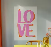 L'immagine è caratterizzata da un design minimalista con la parola "LOVE" a caratteri grandi e decisi. Il testo è scritto in un rosa brillante, con un bordo arancione per aggiungere profondità e contrasto. Le lettere sono disposte in modo sovrapposto, con "LO" sulla riga superiore e "VE" su quella inferiore. Lo sfondo è un bianco sporco e pulito, che mette bene in risalto il testo colorato. Il design complessivo è moderno e giocoso, con un'attenzione particolare al forte messaggio d'amore.
