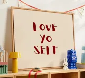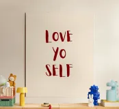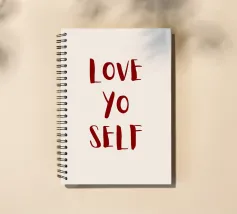 Sfondo beige con scritta in rosso scuro: Love yo self.