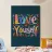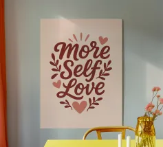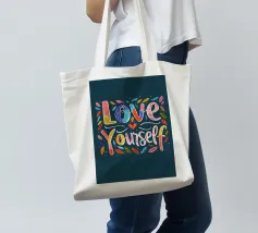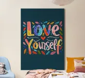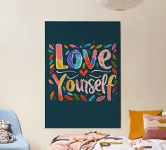 Una colorata scritta disegnata a mano recita "Love Yourself", circondata da foglie e punti vivaci su uno sfondo scuro. Ogni lettera è decorata in modo unico con colori vivaci, completati da un cuore sotto la parola "Love".