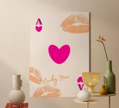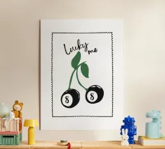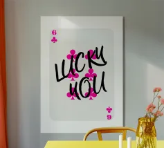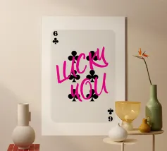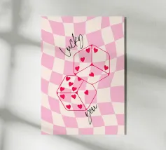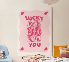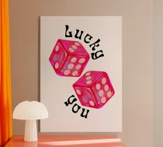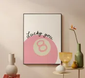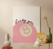 Un cerchio rosa che ricorda una palla da biliardo presenta un "8" al centro e la frase "Lucky you" scritta in caratteri scherzosi. Il disegno trasmette un senso di divertimento e fortuna.