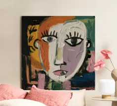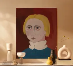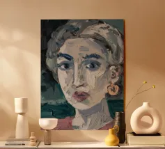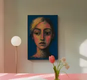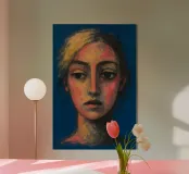 Un ritratto inquietante emerge in audaci pennellate di rosa, giallo e carbone su un campo di cobalto. Texture morbide e impressionistiche si fondono intorno a grandi occhi contemplativi che sembrano contenere luci e ombre interiori in egual misura. La tavolozza contrastante e la pennellata fluida evocano emozioni fugaci e meraviglie introspettive, invitando gli spettatori a soffermarsi su ogni sfumatura di forma e colore. Stampata in qualità d'archivio, quest'opera è un ponte tra l'astrazione espressiva e il realismo del ritratto e costituisce un pezzo forte per salotti, studi o pareti di gallerie che desiderano profondità e vivacità.