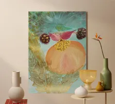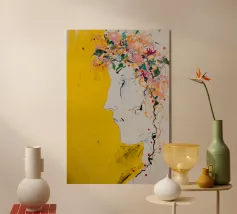 Questo dipinto su sfondo giallo pastello è morbido e rilassante. I fiori colorati contrastano con la semplicità del disegno, creando una sottile armonia.