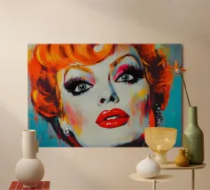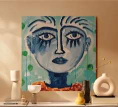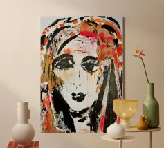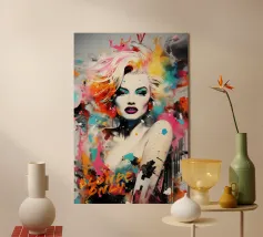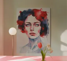 Un suggestivo ritratto di donna il cui volto è ornato da vistose macchie di vernice rossa e blu, con un effetto di sgocciolamento, su uno sfondo vibrante, astratto e colorato.