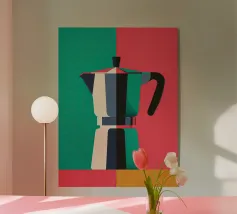coffee maker vintage design italic text bold typography yellow background red coffee pot italian branding retro appliance graphic print coffee theme kitchenware silhouette design classic style advertisement mid-century look kitchen decor simple illustration geometric shapes vintage text print collection