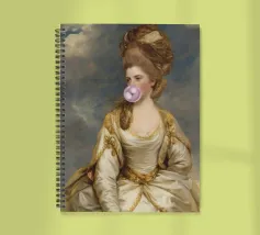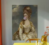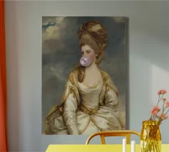 L'eleganza incontra la cultura pop: un ritratto umoristico e moderno". Questo disegno combina l'opulenza e il glamour di un classico ritratto aristocratico con un tocco moderno e inaspettato: una bolla di gomma rosa. Il mix di estetica tradizionale e umorismo contemporaneo rende quest'opera d'arte una dichiarazione unica. Perfetta come decorazione murale, poster o per un design moderno, classico e audace al tempo stesso.