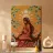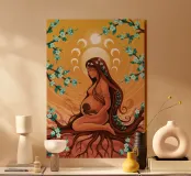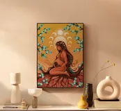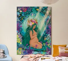 Un dipinto di una figura incinta circondata da simboli celesti e da uno sfondo caldo e terroso.
