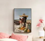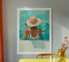 Elegante dipinto di una donna che si rilassa sulla spiaggia con un cappello da sole e un costume da bagno rosso, circondata da frutta tropicale e una bevanda fresca. Questa scena solare cattura il tempo libero, la bellezza e il calore dell'estate. Un'opera d'arte da parete perfetta per l'arredamento costiero, le case di vacanza o gli spazi boho moderni. Ideale per gli amanti dell'estetica tropicale, della vita lenta e delle opere d'arte femminili ed eleganti. Un bellissimo regalo per gli amanti del sole e del lusso rilassato.