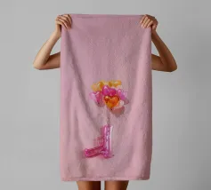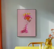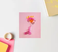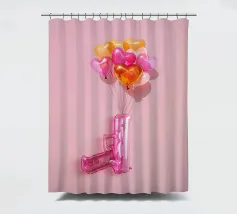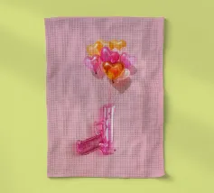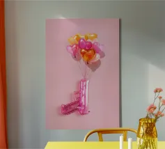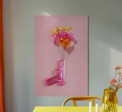Un'opera d'arte creativa con una pistola giocattolo gonfiabile rosa legata a un bouquet di palloncini a forma di cuore nei toni del rosa, dell'arancio e dell'oro. Su uno sfondo rosa pallido, l'immagine combina elementi ludici e provocatori e trasmette il messaggio "Make love, not war" (fate l'amore, non la guerra) con un tocco di pop art. Il contrasto tra la pistola giocattolo e i palloncini a forma di cuore conferisce all'immagine una prospettiva unica sull'amore e la pace e la rende un'attrazione per gli amanti della decorazione moderna.