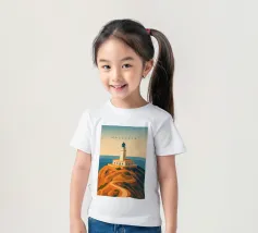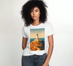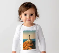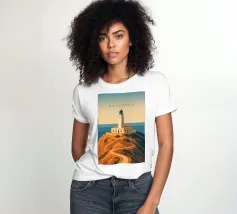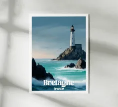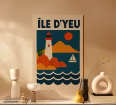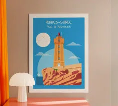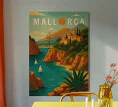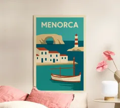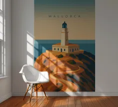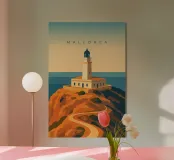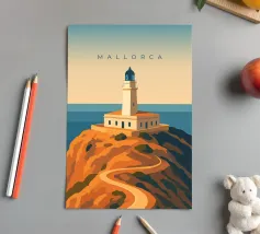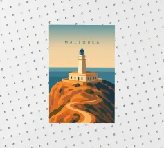 Poster di viaggio minimalista con il bellissimo faro di Faro de Formentor per tutti coloro che amano l'isola spagnola di Maiorca con il suo splendido paesaggio. Design decorativo per le vacanze estive per tutti gli amanti della Spagna e i viaggiatori del Mediterraneo.