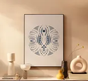 Immergetevi nella sacra simmetria dell'illustrazione "Sacred Mandala", un disegno boho-spirituale caratterizzato da intricati motivi a forma di fiamma e accenti a forma di occhi in un bianco nitido su uno sfondo blu profondo. Ispirata agli antichi mandala e all'armonia spirituale, quest'opera d'arte intreccia motivi organici e circolari con dettagli delicati, accentuati da sottili sfumature dorate che evocano la serenità divina.