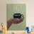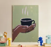 Illustrazione astratta di una mano scura che tiene una tazza di caffè nero. Un delicato vapore sale in leggere linee color lavanda. Lo sfondo è verde chiaro con pennellate sottili. Composizione minimalista con attenzione alla forma, al colore e all'equilibrio.