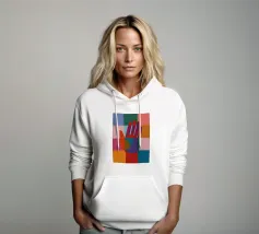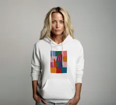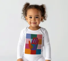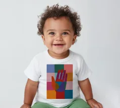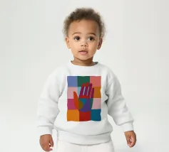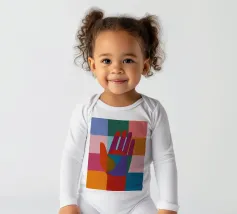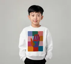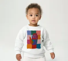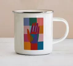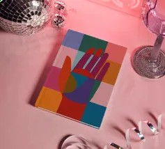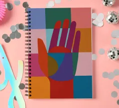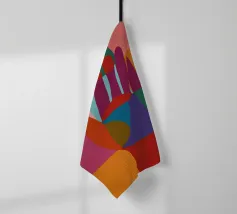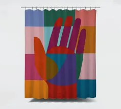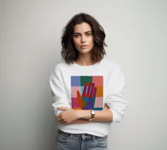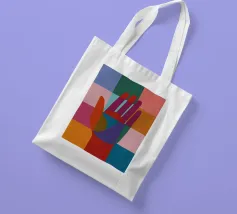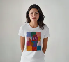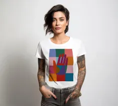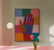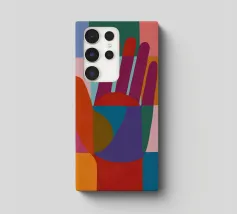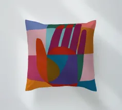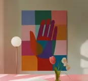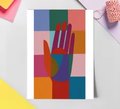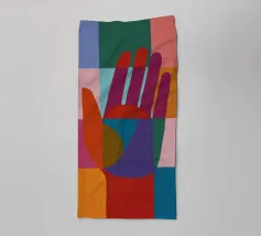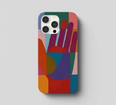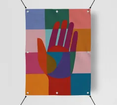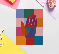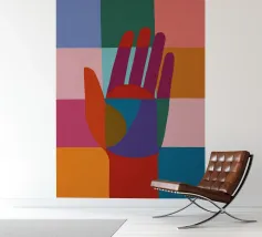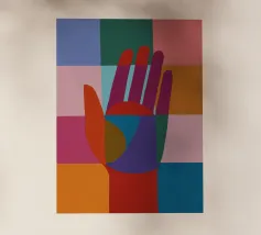 Mano stilizzata composta da forme geometriche e colori stratificati.