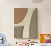 Forme morbide e fluide nei toni della terra si sovrappongono per creare un disegno astratto. La composizione utilizza una tavolozza di beige, marrone e grigio, con un effetto calmante e armonioso.