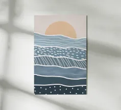 Questa opera d'arte digitale stilizzata cattura l'energia dinamica delle onde dell'oceano in una suggestiva tavolozza di blu indaco profondo su uno sfondo beige caldo e strutturato. Le onde sono rappresentate con linee audaci e ritmiche che creano un senso di movimento e profondità. Un cerchio solitario di colore arancione bruciato nell'angolo in alto a sinistra suggerisce un sole o una luna, aggiungendo un tocco di tranquillità celeste alla scena altrimenti energica. L'estetica complessiva è moderna, minimalista ed evoca una sensazione di potenza e serenità.