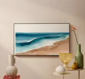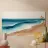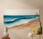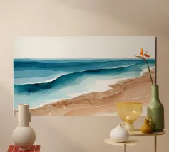Soft bands of blue drift toward shore, blending seamlessly with warm, sandy tones. The calm rhythm of layered watercolor suggests a slow, meditative ebb of waves under an open sky.