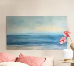 Morbide bande di blu vanno alla deriva verso la riva, mescolandosi perfettamente con i toni caldi e sabbiosi. Il ritmo calmo dell'acquerello stratificato suggerisce un lento e meditativo riflusso delle onde sotto un cielo aperto.