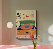 Un'illustrazione allegra e vibrante di un giradischi portatile vintage, che sprigiona energia Groovy/Retro. La custodia del giradischi è decorata con un audace motivo a scacchi bianchi e arancioni senape, che unisce gli stili geometrici della Pop Art a un'atmosfera disegnata a mano. Il vinile arancione è caratterizzato da vorticose linee bianche che suggeriscono movimento e musica. Intorno alla scena fluttuano note musicali astratte, fiori stilizzati e un cuore rosso brillante, simbolo di una canzone d'amore o della passione per la musica. Su uno sfondo a strisce gialle e rosa, questo pezzo è puro Dopamine Decor e ideale per gli amanti della musica. Il