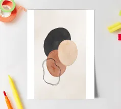 Aggiungete un tocco di fascino minimalista al vostro spazio con questa vibrante stampa d'arte astratta moderna di metà secolo, caratterizzata da un'ipnotica miscela di forme geometriche e fluide di acquerello su uno sfondo neutro morbido e cremoso. Con la sua calda atmosfera scandinavo-giapponese, non è solo arte: è un'atmosfera.